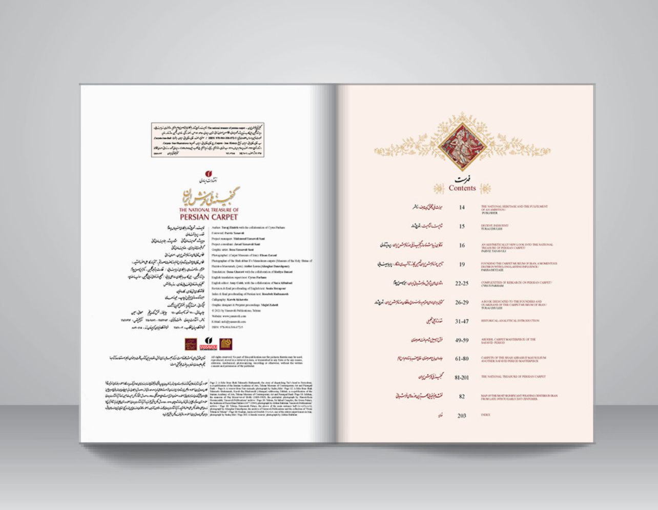 مؤلف: تورج ژوله با همکاری دکتر سیروس پرهام مقدمه: پرویز تناولی عکاس قالی های موزه فرش ایران: احسان زرانی مترجم: دانا غروی با همکاری ردیا بنایی نظارت بر ترجمه انگلیسی: دکتر سیروس پرهام ویراستار ، تنظیم نمایه و نمونه خوان فارسی: روزبه رادمنش تصحیح و نمونه خوانی انگلیسی: سونیا رضاپور خوشنگاری متن فارسی: کاوه اخوین شابک: 5-072-306-964-978قطع کتاب: سلطانی تعداد صفحه: 212زبان: فارسی - انگلیسی نوبت چاپ: اول نوع جلد: جلد سخت همراه با قاب نفیس نوع کاغذ: گلاسه وزن: 7450